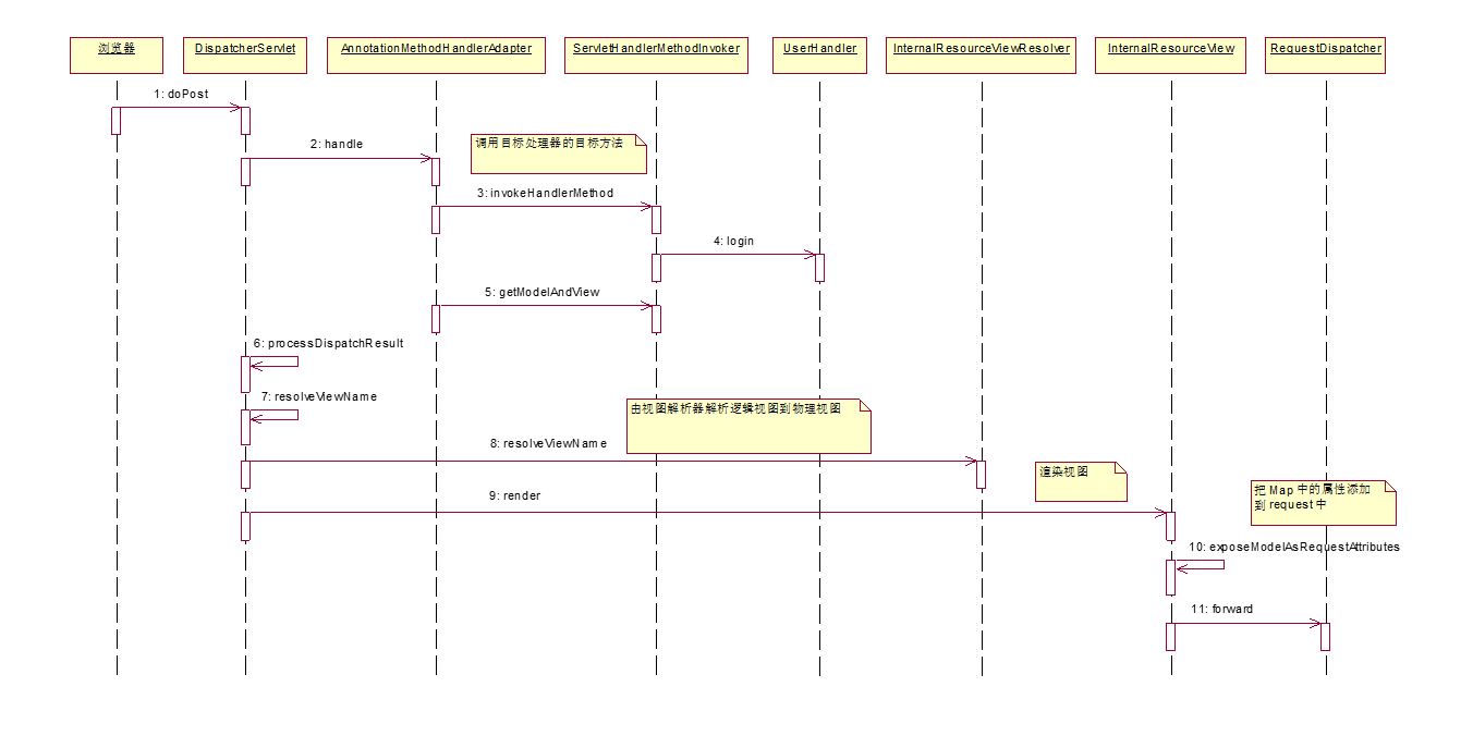 DispatcherServlet:前端控制器Controller:处理器/页面控制器,做的是MVC中的C的事情,但控制逻辑转移到前端控制器了,用于对请求进行处理HandlerMapping:请求映射到处理器,找谁来处理,如果映射成功返回一个HandlerExecutionChain对象(包含一个Handler处理器(页面控制器)对象、多个**HandlerInterceptor**拦截器对象)View Resolver: 视图解析器,找谁来处理返回的页面。把逻辑视图解析为具体的View,进行这种策略模式,很容易更换其他视图技术;- 如
