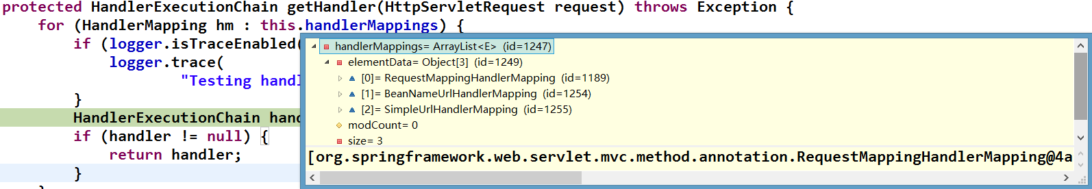 根据该URI,调用HandlerMapping获得该Handler配置的所有相关的对象(包括Handler对象以及Handler对象对应的拦截器),最后以HandlerExecutionChain对象的形式返回;