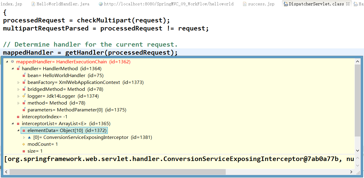 HandlerExecutionChain mappedHandler;包含了拦截器和处理器方法;