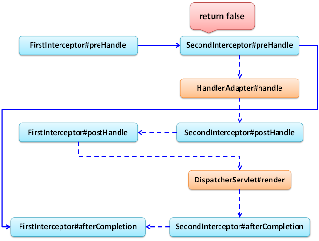 HandlerMapping implementations can support mapped interceptors but do not have to. A handler will always be wrapped in a HandlerExecutionChain instance, optionally accompanied by some HandlerInterceptor instances. The DispatcherServlet will first call each HandlerInterceptor's preHandle method in the given order, finally invoking the handler itself if all preHandle methods have returned true.