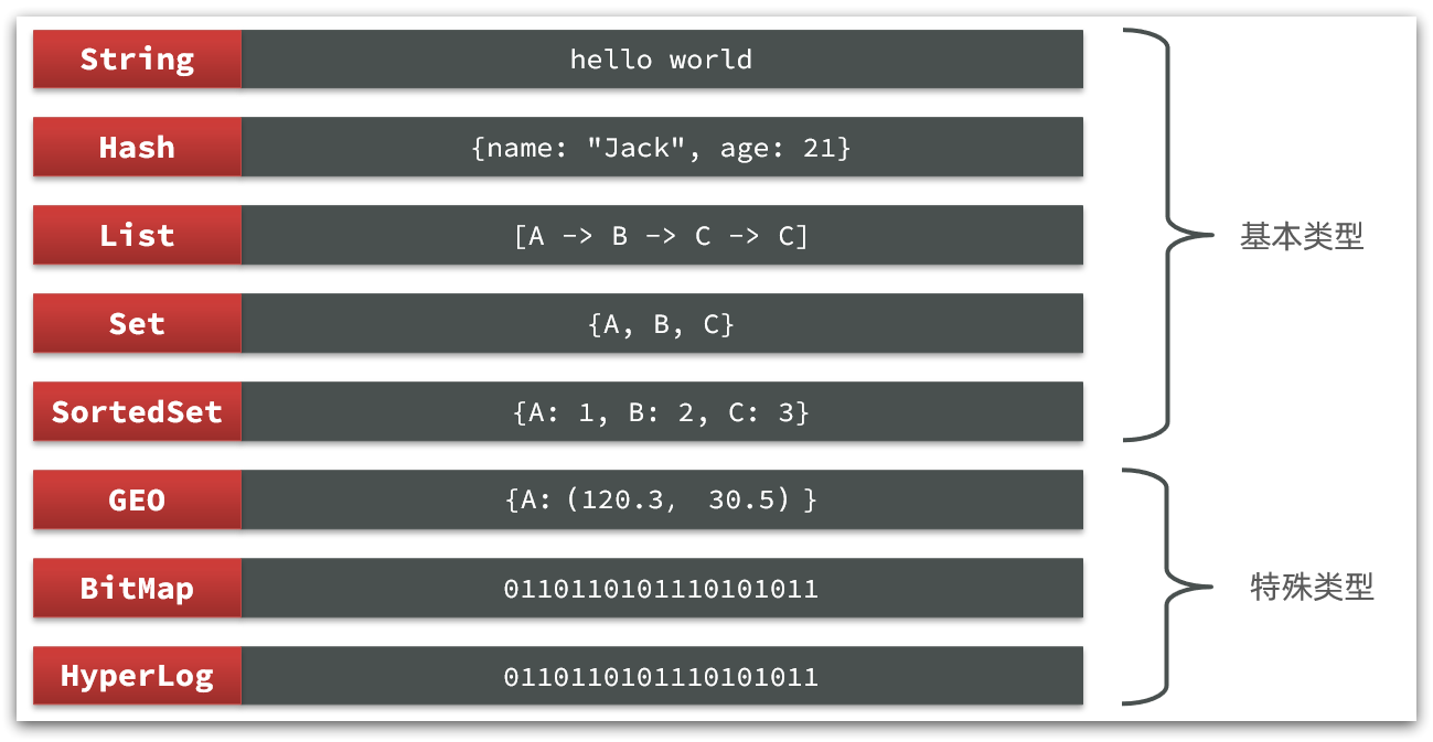 其中键值型,是指Redis中存储的数据都是以key、value对的形式存储,而value的形式多种多样,可以是字符串、数值、甚至json: